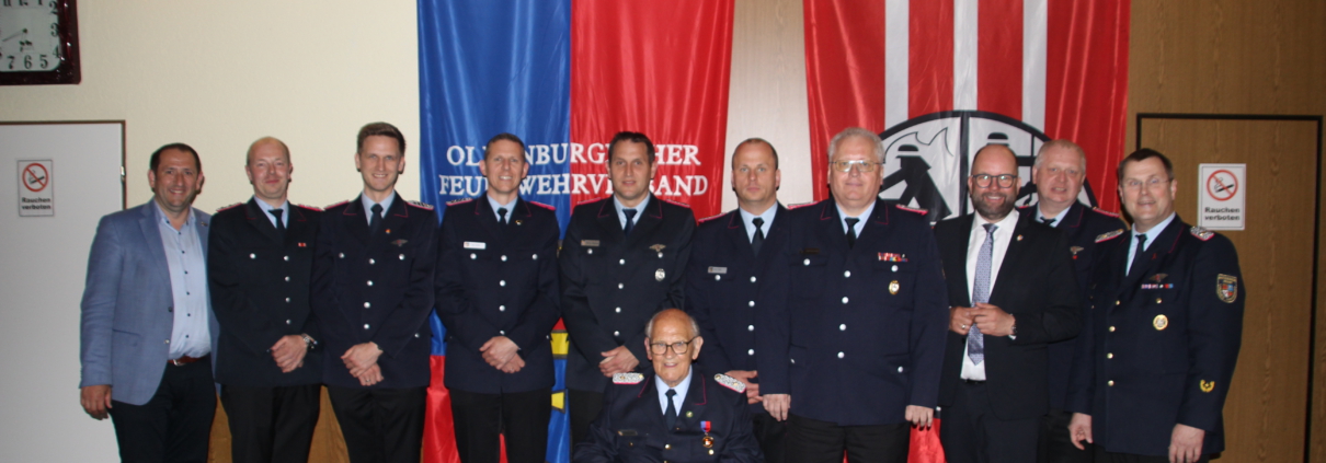 Eine besondere Ehrung erhielt Kamerad Hans Stör, ihm wurde die Verdienstmedaille des Kreisfeuerwehrverbandes Cloppenburg in Gold überreicht. Hans Stör war stellv. Stadtbrandmeister der Stadt Cloppenburg, KBM des LK Cloppenburg, OFV Vorstandsmitglied, Mitglied der getreuen des OFV Oldenburg.