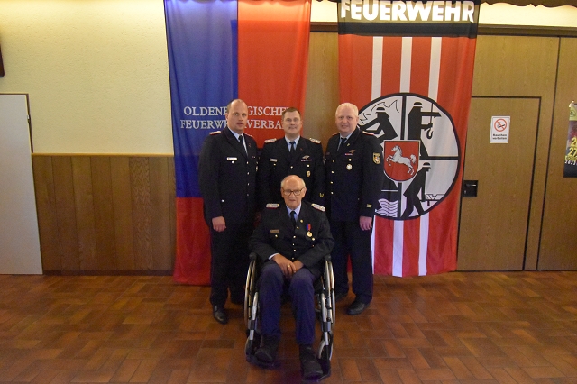 Eine besondere Ehrung erhielt Kamerad Hans Stör, ihm wurde die Verdienstmedaille des Kreisfeuerwehrverbandes Cloppenburg in Gold überreicht. Hans Stör war stellv. Stadtbrandmeister der Stadt Cloppenburg, KBM des LK Cloppenburg, OFV Vorstandsmitglied, Mitglied der getreuen des OFV Oldenburg.