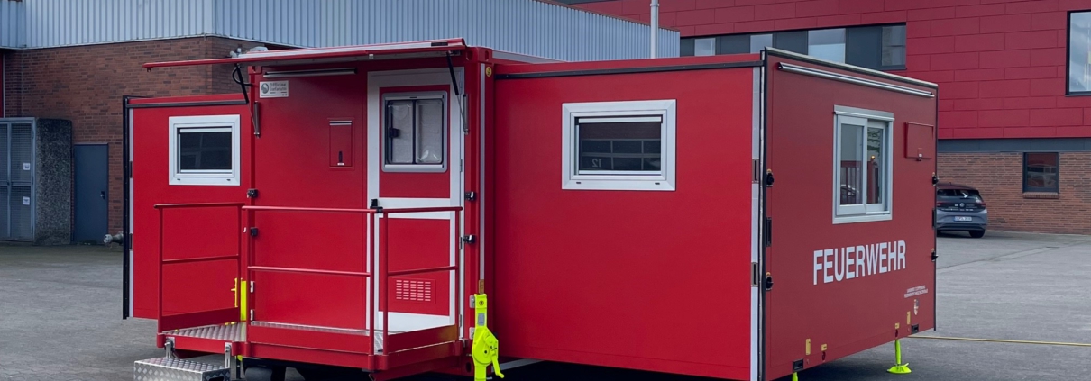 Der nun in den Dienst gestellte AB kann diese Anforderungen zu 100 % erfüllen. Die Einsatzfähigkeit des AB mit 2 Seitenauszügen lässt sich mit wenigen Handgriffen in kurzer Zeit herstellen. Dabei ist es möglich, den AB sowohl im aufgesattelten als auch im abgesattelten Zustand zu nutzen. Im über 30 qm großen Innenraum wurde auf fest eingebaute Tische verzichtet, so dass der Innenraum je nach Einsatzlage variabel gestaltet werden kann. An den Innenwänden wurden insgesamt Anschlüsse für 6 Arbeitsplätze (Netzwerk, Strom, USB, HDMI) verbaut. Über eine Deckenklinge lässt sich ein HUB installieren, der für weitere 10 Arbeitsplätze Strom-, Netzwerk-, USB- und HDMI-Anschlüsse bereitstellt. Bilder, Karten und Lagen lassen sich über einen Wandmonitor sowie einen Beamer darstellen. Neben Digitalfunk sorgt eine Telefonanlage mit Internetverbindung für die notwendigen Kommunikationsverbindungen. Der klimatisierte AB besitzt mehrere LED-Beleuchtungsmodi in verschieden dimmbaren Farben, um je nach Einsatzgeschehen und Nutzung eine optimale Arbeitsbeleuchtung zu gewährleisten.
