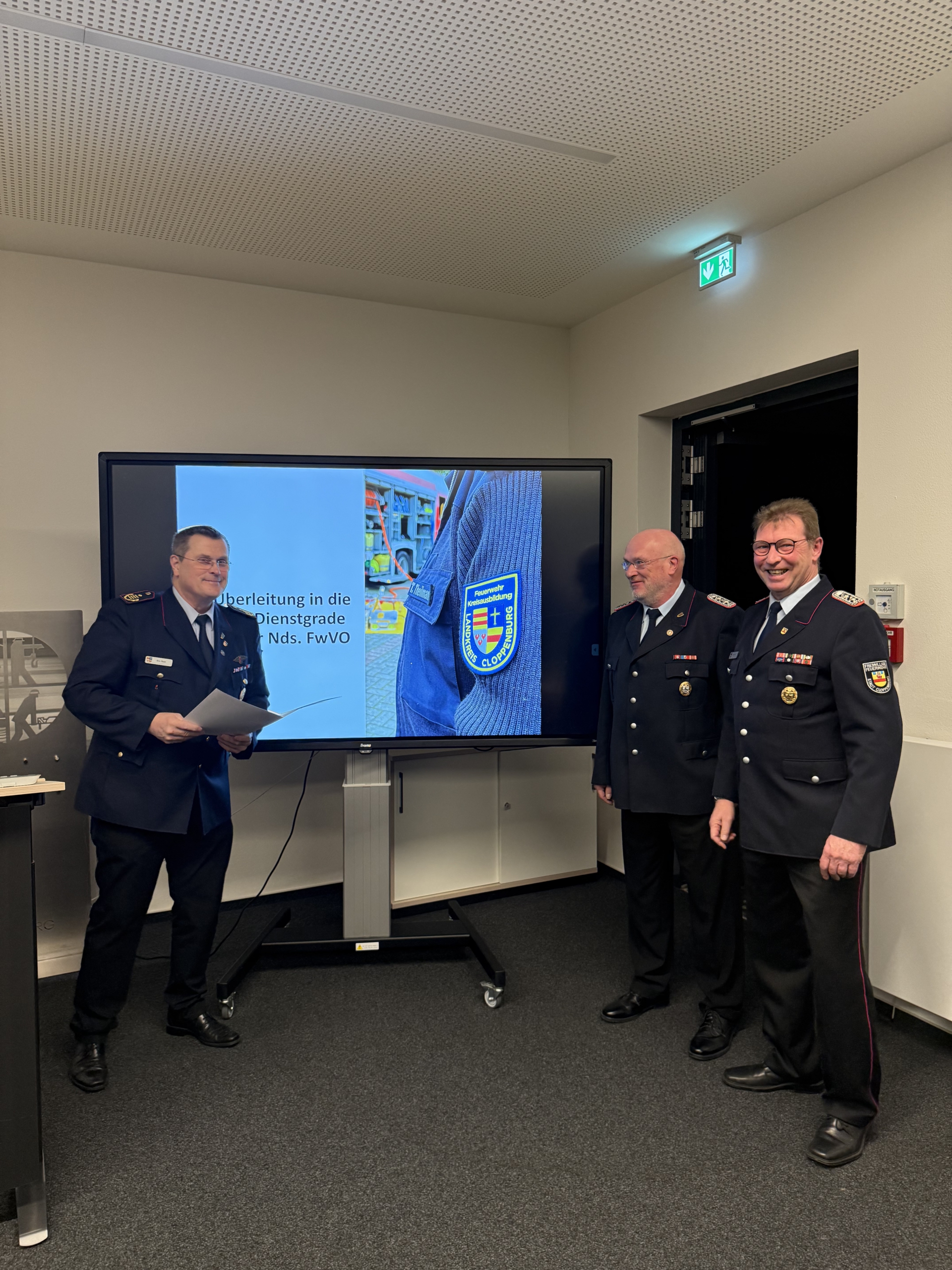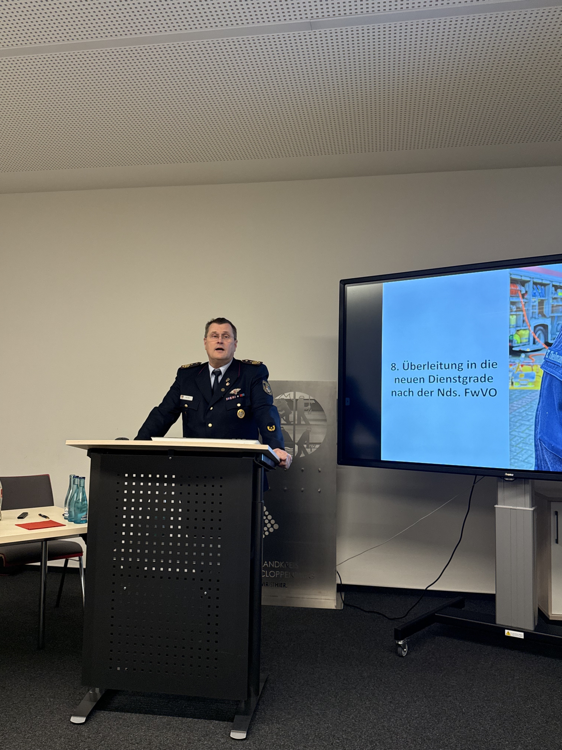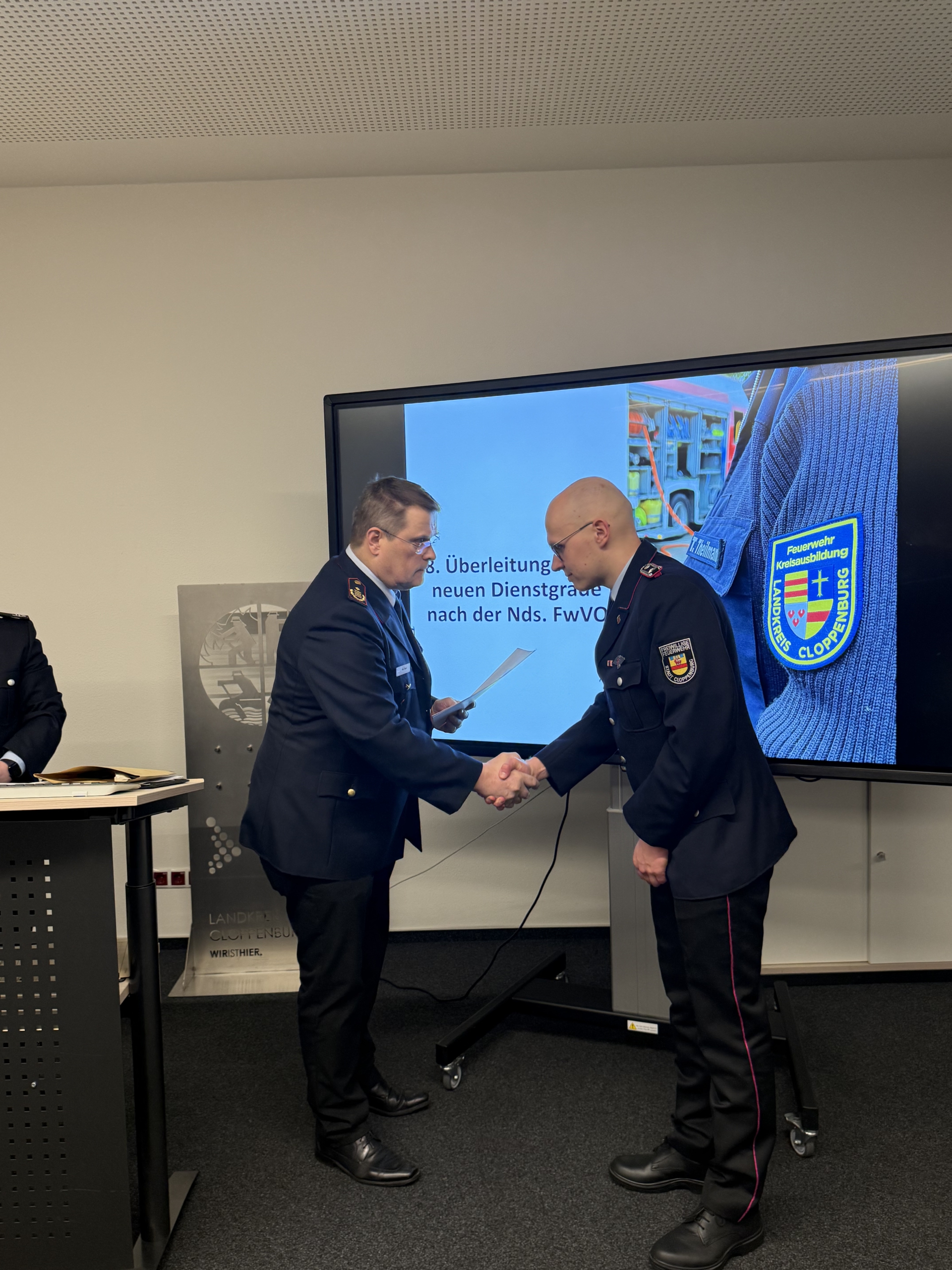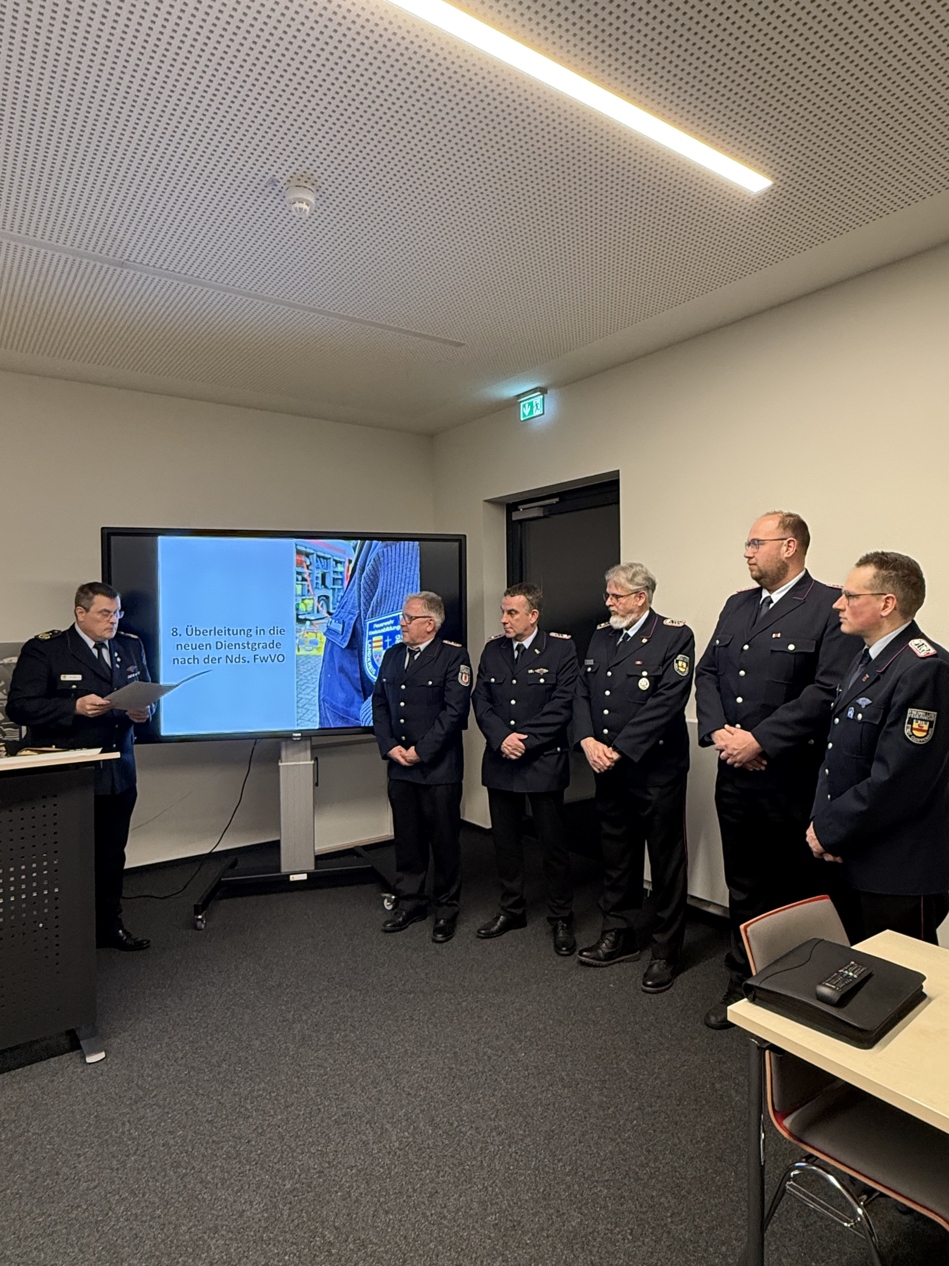 Im weiteren Verlauf des Abends wurde zudem die Überleitung in die neuen Dienstgrade nach der Niedersächsischen Feuerwehrverordnung (Nds. FwVO) vollzogen. Dazu überreichte Kreisbrandmeister Arno Rauer die Urkunden und gab die neuen Schulterstücke an die Kreisausbilder aus.