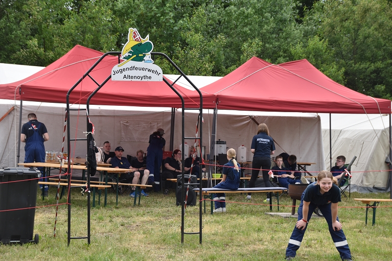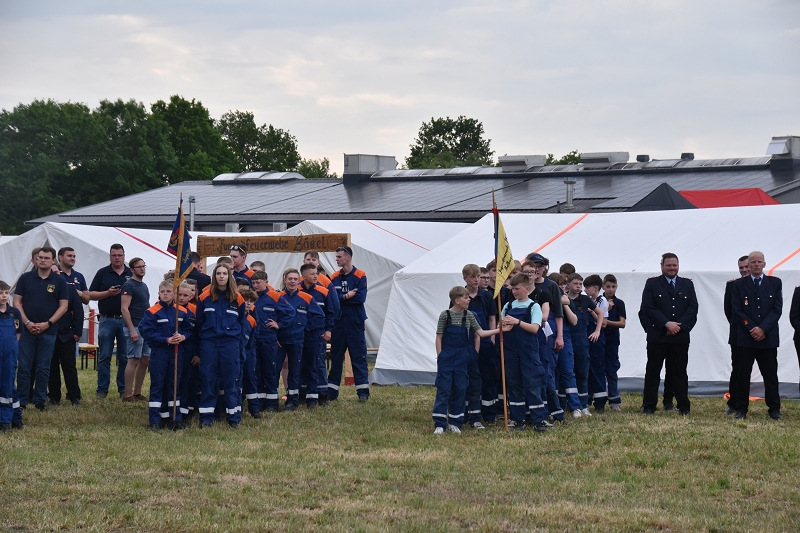 Am Freitag, den 17. Mai 2024 wurde das Pfingstzeltlager der Kreisjugendfeuerwehr Cloppenburg bei sonnigen Temperaturen in Scharrel durch den Kreisjugendfeuerwehrwart David Middendorf und seinen Stellv. Henning Hibben und Jan Wasserthal sowie Kreisbrandmeister Arno Rauer eröffnet.  David Middendorf konnte zahlreiche Ehrengäste begrüßen u.a.: Stellv. Kreisbrandmeister Franz Josef Nording, Regierungsbrandmeister und OFV Vorsitzender Udo Schwarz, Bürgermeister Thomas Otto aus dem Saterland, Silvia Breher MdB, Stefan Christ MdL, Kreisrätin Anne Tapken, Daniel Plate vom Ordnungsamt, Stellv. Bezirksjugendfeuerwehrwart Philip Klaassens, Leiter der Polizeiinspektion Cloppenburg/ Vechta Jörn Kreikebaum, Ratsmitglieder der Gemeinde Saterland, alle Gemeinde und Ortsbrandmeister des KFV Cloppenburg und natürlich alle Mädchen und Jungen. Bei den ca. 450 Jugendlichen mit ihren Betreuern handelt es sich um 16 Jugendfeuerwehren aus dem Landkreis Cloppenburg und jeweils 1 Gruppe des THW´s und der DLRG, diese werden bis Montag in Scharrel verweilen. Nach den Grußworten von Arno Rauer,  Politik und Verwaltung wurde das Zeltlager 2024 eröffnet. Eine besondere Überraschung hatte Kreisbrandmeister Arno Rauer für die Kreisjugendfeuerwehrwarte noch in petto. David Middendorf, Henning Hibben und Jan Wasserthal wurden zum Brandmeister befördert. Nach den Beförderungen ging es für die einzelnen Gruppen zum Orientierungsmarsch durch Scharrel, was den Mädchen und Jungen sehr viel Spaß bereitet hat. Gegen 23:00 Uhr hieß es dann für alle Teilnehmer Lagerruhe.
