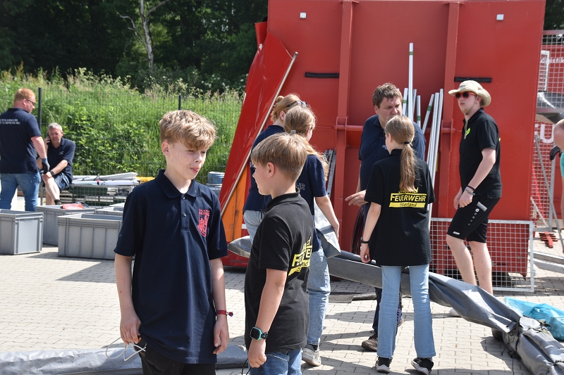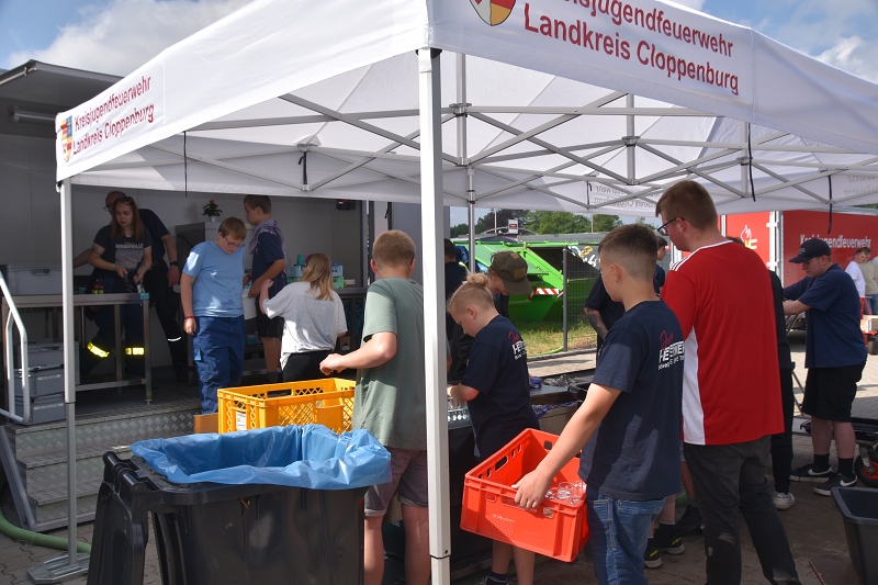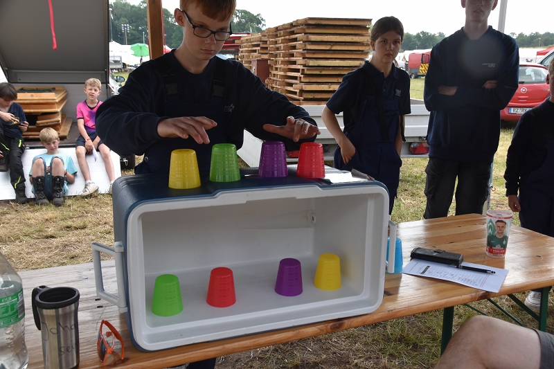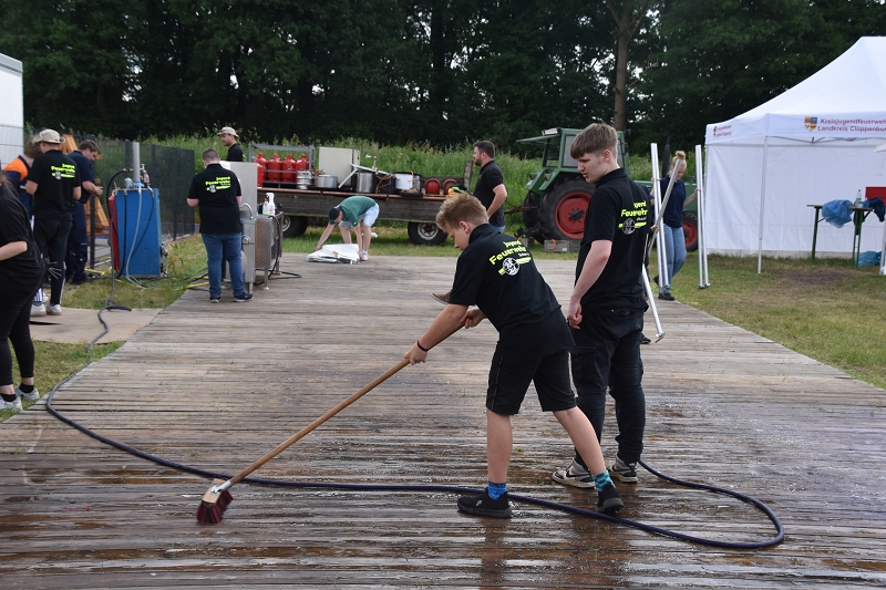 Am Montag ging es mit einem weinenden und einem lachenden Auge dem Ende des Pfingstzeltlager entgegen, Freundschaften wurden geschlossen und der Zusammenhalt zwischen den einzelnen Jugendfeuerwehren wurde gestärkt. Gegen 9:00 Uhr gab es dann die ,,Lagerolympiade“, was den Kids sehr viel Spaß machte. Nach dem Mittagessen wurde dann langsam alles verpackt, Zelte abbauen, Feuerstellen und den Platz säubern. Gegen 15:00 Uhr ging es noch einmal für alle Gruppen auf den Sammelplatz, wo dann die Pokalverleihung stattfand. Kreisjugendfeuerwehrwart David Middendorf bedankte sich noch einmal bei seinen Stellvertretern Henning Hibben und Jan Wasserthal für die sehr gut Mithilfe im Zeltlager. Auch der Stellv. Kreisbrandmeister Franz-Josef Nording bedankte sich bei allen Teilnehmerinnen und Teilnehmern für das sehr gut geplante Zeltlager. Weiter ging es zur Pokalverleihung, hier wurden folgende Plätze erreicht: