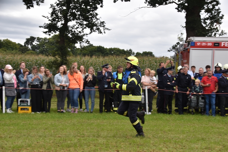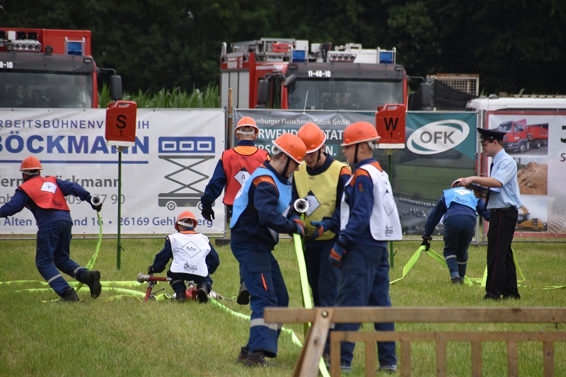 Im Anschluss begannen die Wettbewerbe, die rund 900 Zuschauer auf den Festplatz lockten. Bei den Gruppen galt es, in den Kategorien TLF (Tanklöschfahrzeug), TS (Tragkraftspritze) und Jugendfeuerwehr Schnelligkeit, technisches Wissen und Teamarbeit unter Beweis zu stellen. Zahlreiche Schiedsrichter sorgten für faire Abläufe. Ein besonderes Highlight war die Wettkampfübung TS von den Führungskräften im Bereich des Oldenburgischen Feuerwehrverbandes. Hier schauten fast alle Einsatzkräfte und Zuschauer diese Übung zu, man musss im nach hinein sagen, es war rundum eine gelungene Leistung.