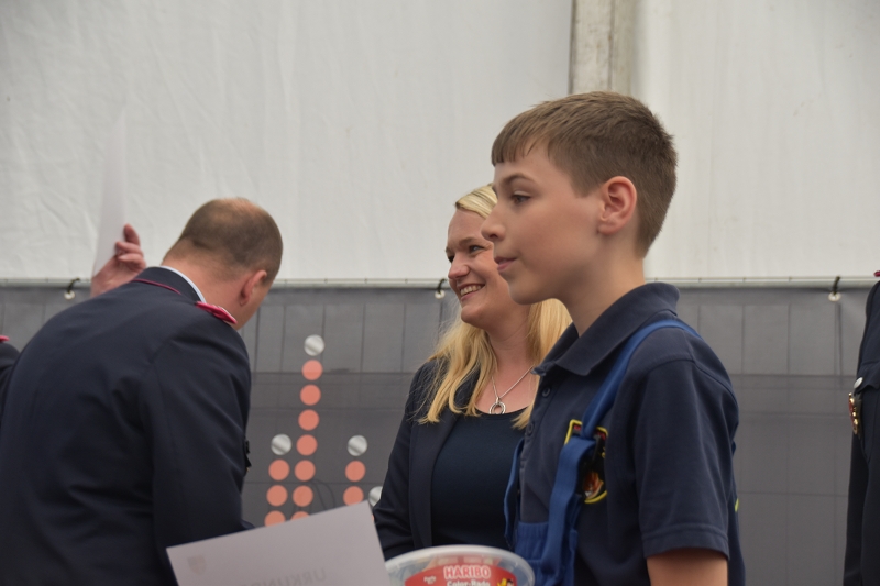 Gegen 17:30 Uhr fand im Festzelt die große Siegerehrung statt, Kreisbrandmeister Arno Rauer, Stellv. Kreisbrandmeister Franz-Josef Nording, Stellv. Kreisbrandmeister Stefan Abshof, Stellv. Kreisjugendwart Jan Wasserthal und 1. Kreisrätin Anne Tabken überreichten die Pokale und Urkunden an folgende Gewinner: