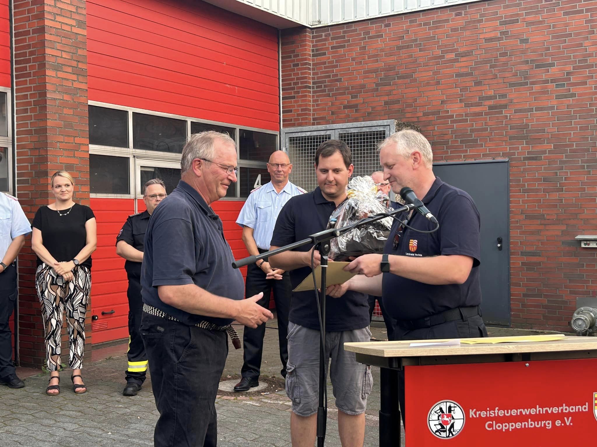 Cloppenburg – Nach der Übung gegen 18:00 Uhr, ging es für alle Einsatzkräfte zur FTZ Cloppenburg zu einem gemütlichen und wohlverdienten gemütlichen Abend. Nach den Dankes- und Grußworten von KBM Arno Rauer, Regierungsbrandmeister Udo Schwarz, Kreisrätin Anne Tapken und KBM Matthias Trumme Lk Vechta, wurden dann noch einige Einsatzkräfte aus den Kreisfeuerwehrbereitschaften Vechta, Cloppenburg und aus dem Ammerland durch ihre lange Zugehörigkeit in der KFB geehrt. Auch hier möchten wir uns den Glückwünschen anschließen. Anschließend ging es zum gemütlichen Teil, mit Musik und ausgelassener Stimmung ließ man den Abend ausklingen.