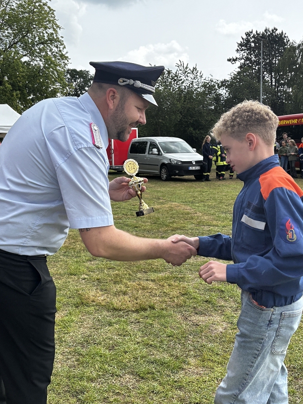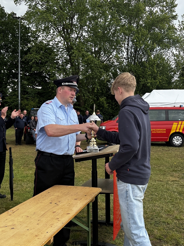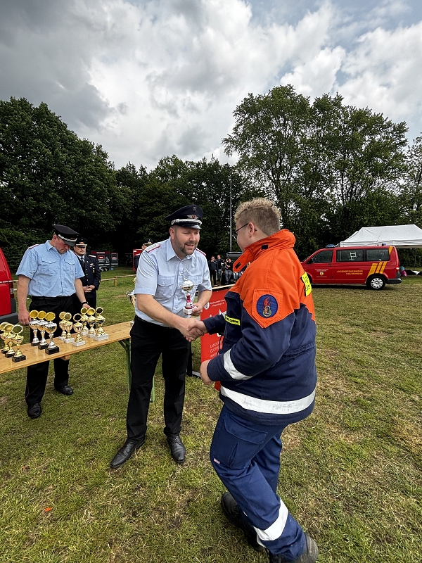 Gegen 17:30 Uhr fand im Festzelt die große Siegerehrung statt, Kreisbrandmeister Arno Rauer, Stellv. Kreisbrandmeister Franz-Josef Nording, Stellv. Kreisbrandmeister Stefan Abshof, Stellv. Kreisjugendwart Jan Wasserthal und 1. Kreisrätin Anne Tabken überreichten die Pokale und Urkunden an folgende Gewinner: