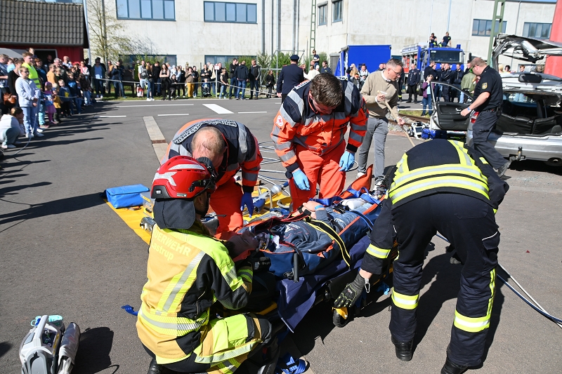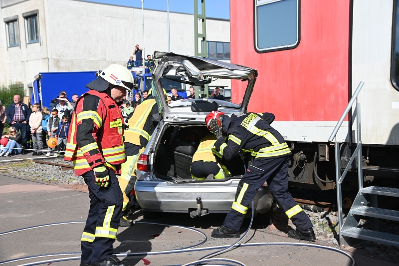 Das abwechslungsreiche Programm bot spektakuläre Einsatzübungen wie einen Zugunfall mit Brand, eine THW-Übung zum Thema „Öl auf Gewässer“ sowie die realistische Darstellung eines Verkehrsunfalls „PKW gegen Baum“. Besonders eindrucksvoll waren zudem die Vorführungen von Fettexplosionen und Feuerlöschungen.