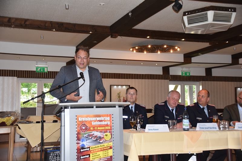 Herzlichen Dank für die Einladung – für mich ist das heute fast ein Heimspiel. Passend zum Kreisfeuerwehrtag in Gehlenberg freue ich mich sehr, heute Abend hier zu sein. Diese Tage stehen ganz im Zeichen unserer Feuerwehren – ein starkes Signal für den gelebten Zusammenhalt in unserem Landkreis. Bereits am Samstag fand die Verbandsversammlung des Oldenburgischen Feuerwehrverbandes statt – mein herzlicher Glückwunsch gilt Udo Schwarz zur Wiederwahl. Ich freue mich auf die weitere gute und vertrauensvolle Zusammenarbeit mit allen, die im Landkreis Verantwortung für unsere Feuerwehren tragen. Die Aufgaben der Feuerwehren haben sich in den letzten Jahren deutlich erweitert – sie gehen längst über das Retten, Löschen und Bergen hinaus. Ein Rückblick auf das Hochwasser an der Hase zeigt eindrucksvoll: Ohne die Feuerwehren wäre vieles nicht machbar gewesen. Trotz aller Herausforderungen – gerade auch über die Feiertage hinweg – haben wir die Lage gut gemeistert. Doch eines ist klar: Solche Ereignisse werden uns in Zukunft häufiger begegnen und unsere Feuerwehren weiterhin fordern. Die technische Entwicklung und neue Gefahrenlagen stellen hohe Anforderungen. Es ist beeindruckend zu sehen, wie die Kameradinnen und Kameraden diesen Wandel nicht nur mitgehen, sondern aktiv mitgestalten. Dem Landkreis ist es daher ein zentrales Anliegen, die Feuerwehren gut auszustatten – unterstützt von den politischen Gremien mit voller Rückendeckung. Besonders hervorzuheben ist auch die Zuweisung eines ABC-Erkundungsfahrzeugs des Bundes an unseren Landkreis – es dient dem Spüren, Messen und Melden von Gefahrstoffen. Zudem steht uns künftig ein GW-Logistik für Katastrophenschutzlagen zur Verfügung, insbesondere für Gebiete mit beeinträchtigter Infrastruktur. Denn: Moderne Gefahrenlagen brauchen moderne Geräte.