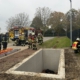 Ein Gebäude ist eingestürzt, unter dem Trümmerberg liegt eine Betonröhre unter der eine verletzte Person zu befreien ist. Die Trümmer müssen schnellstmöglich entfernt werden, um die verletzte Person freizulegen und sicher zu retten. Der Brandschutz muss wegen Funkenflug sicherstellt werden. Weitere Trümmer fallen während der Rettung auf die Einsatzstelle, was zusätzliche Sicherheitsmaßnahmen erfordert.