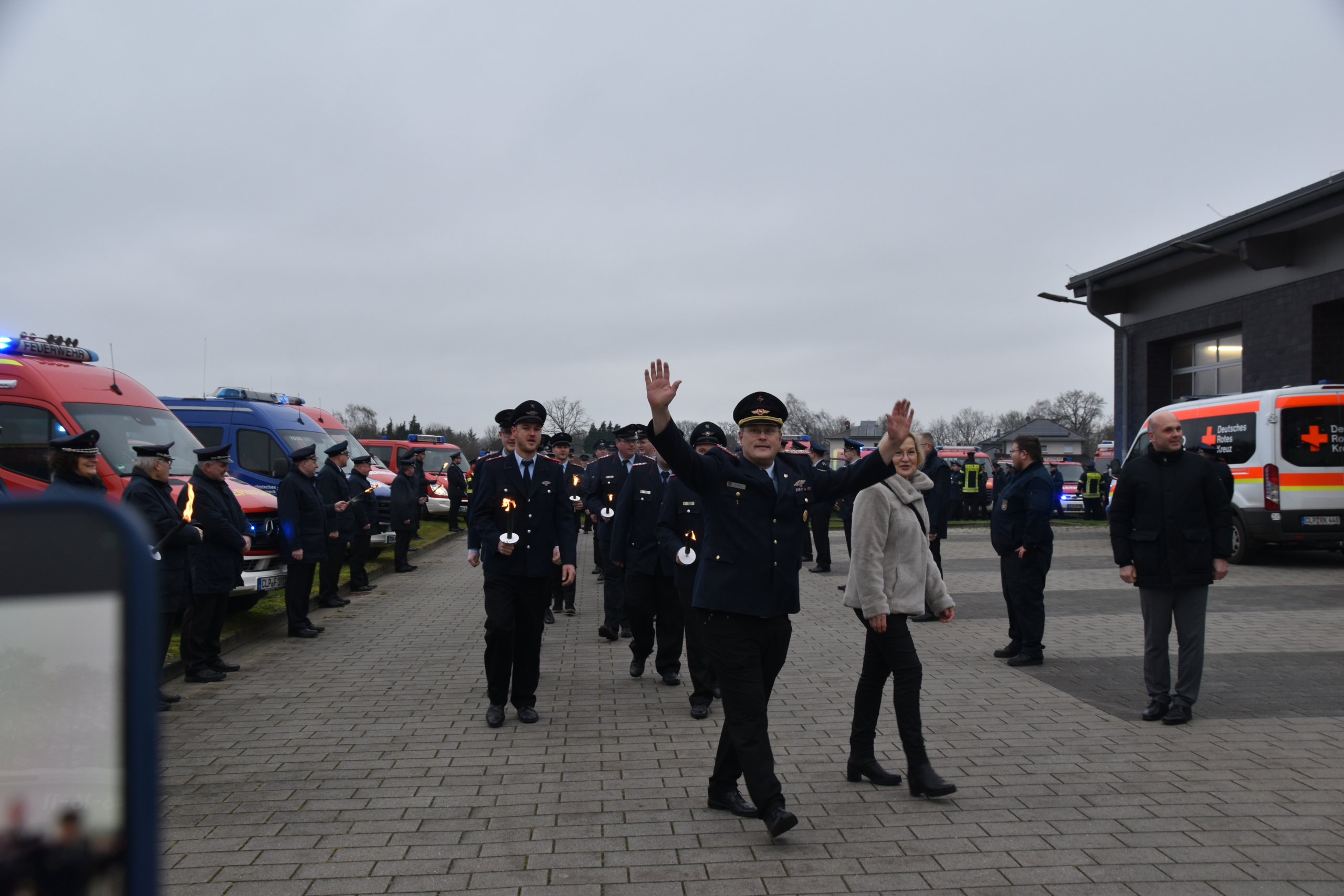 Ein besonderer Dank gilt meinen Kameradinnen und Kameraden der Feuerwehren aus dem gesamten Landkreis Cloppenburg, dem THW Cloppenburg, Bürgermeister Thomas Höffmann, Regierungsbrandmeister Udo Schwarz, KBM a.D. Heinrich Oltmanns, Stellv. KBM a.D. Berthold Bäker, das PSNV Team und natürlich nicht zu vergessen die Musikführenden Züge aus den Feuerwehren, für die großartige Organisation und die herzliche Gestaltung dieses besonderen Anlasses. Der Empfang mit dem Feuerwehr-Oldtimer vor meiner Haustür und die beeindruckende Fackel-Spalierbildung in Garrel haben mich tief berührt und bleiben mir für immer in Erinnerung.