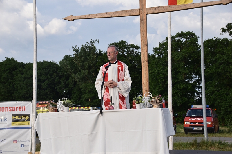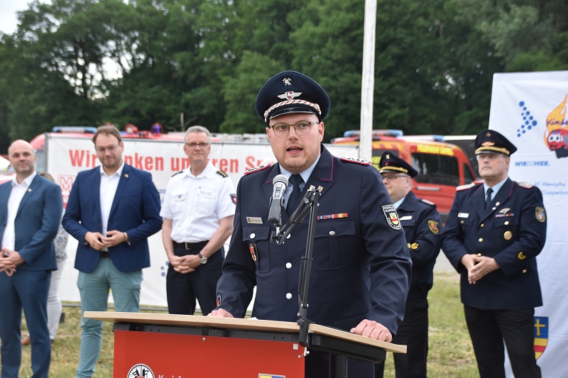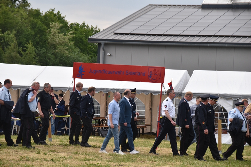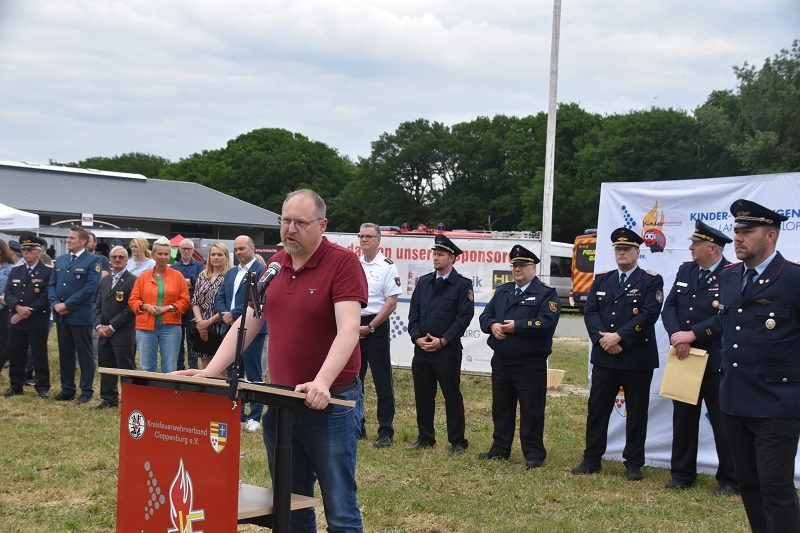 Am Freitag, den 17. Mai 2024 wurde das Pfingstzeltlager der Kreisjugendfeuerwehr Cloppenburg bei sonnigen Temperaturen in Scharrel durch den Kreisjugendfeuerwehrwart David Middendorf und seinen Stellv. Henning Hibben und Jan Wasserthal sowie Kreisbrandmeister Arno Rauer eröffnet. David Middendorf konnte zahlreiche Ehrengäste begrüßen u.a.: Stellv. Kreisbrandmeister Franz Josef Nording, Regierungsbrandmeister und OFV Vorsitzender Udo Schwarz, Bürgermeister Thomas Otto aus dem Saterland, Silvia Breher MdB, Stefan Christ MdL, Kreisrätin Anne Tapken, Daniel Plate vom Ordnungsamt, Stellv. Bezirksjugendfeuerwehrwart Philip Klaassens, Leiter der Polizeiinspektion Cloppenburg/ Vechta Jörn Kreikebaum, Ratsmitglieder der Gemeinde Saterland, alle Gemeinde und Ortsbrandmeister des KFV Cloppenburg und natürlich alle Mädchen und Jungen. Bei den ca. 450 Jugendlichen mit ihren Betreuern handelt es sich um 16 Jugendfeuerwehren aus dem Landkreis Cloppenburg und jeweils 1 Gruppe des THW´s und der DLRG, diese werden bis Montag in Scharrel verweilen. Nach den Grußworten von Arno Rauer, Politik und Verwaltung wurde das Zeltlager 2024 eröffnet. Eine besondere Überraschung hatte Kreisbrandmeister Arno Rauer für die Kreisjugendfeuerwehrwarte noch in petto. David Middendorf, Henning Hibben und Jan Wasserthal wurden zum Brandmeister befördert. Nach den Beförderungen ging es für die einzelnen Gruppen zum Orientierungsmarsch durch Scharrel, was den Mädchen und Jungen sehr viel Spaß bereitet hat. Gegen 23:00 Uhr hieß es dann für alle Teilnehmer Lagerruhe.
