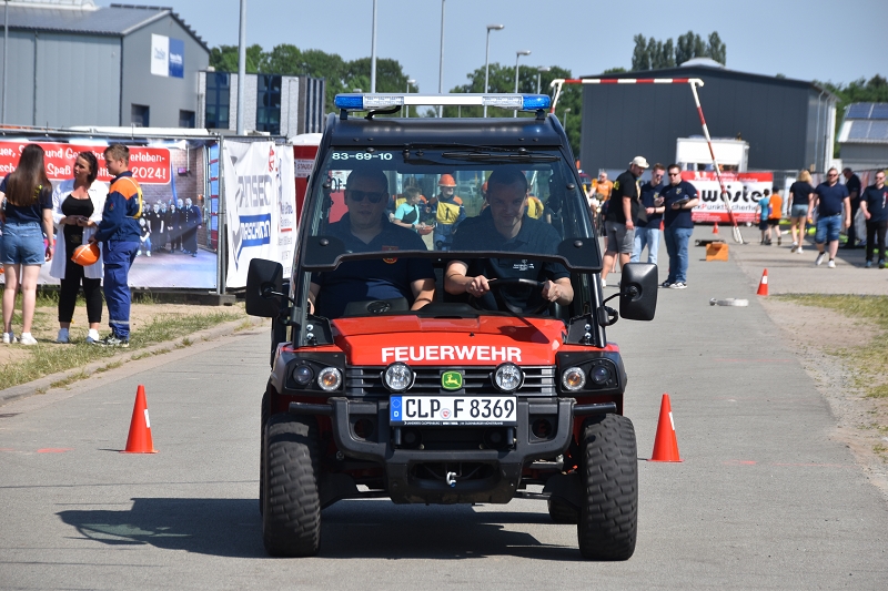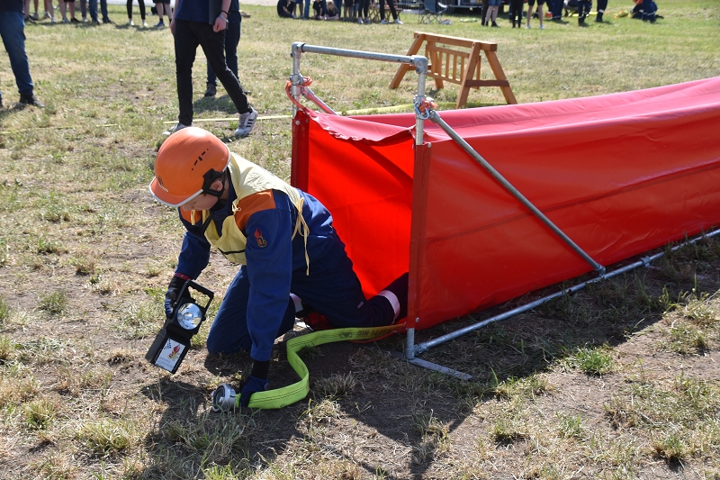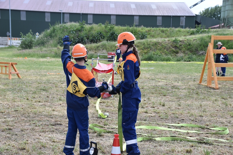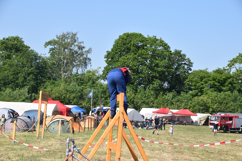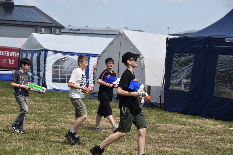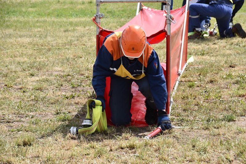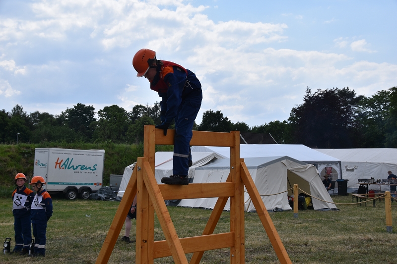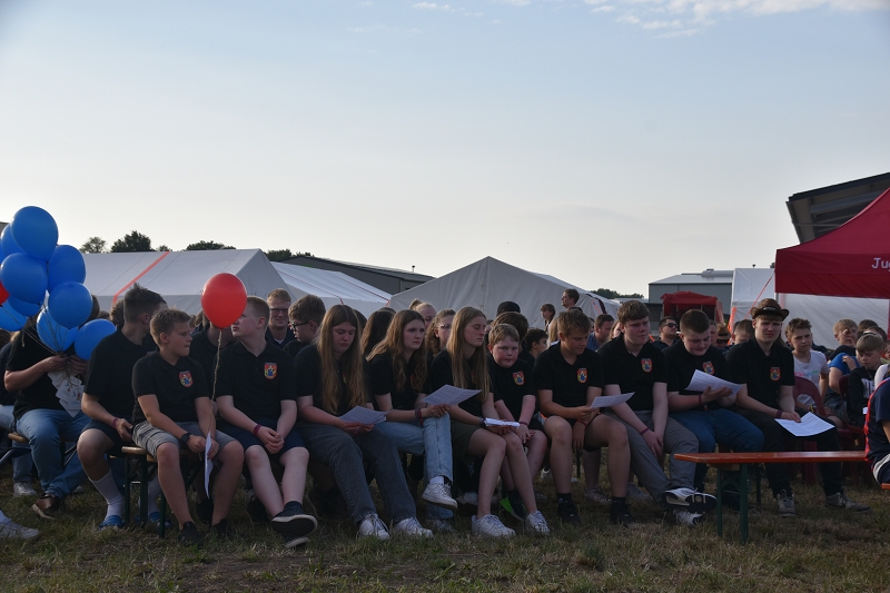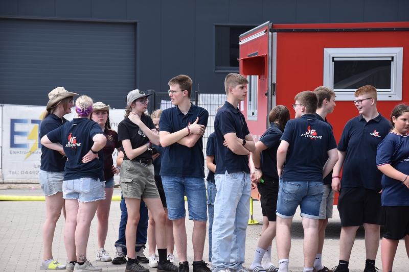 Am Samstag wurde gegen 08:00 Uhr gefrühstückt, hier ein großes Lob an die Küchencrew. Gegen 09:00 Uhr ging es dann für die Gruppen zum Bundeswettbewerb, bei dem sowohl körperliche Geschicklichkeit als auch umfangreiches Feuerwehrwissen gefragt waren. In verschiedenen Disziplinen, die sowohl technisches Geschick als auch Reaktionsschnelligkeit erfordern, mussten die Teilnehmer ihr können unter Beweis stellen. Der Bundeswettbewerb wurde ins Leben gerufen, um die feuerwehrtechnische Ausbildung in der Jugendfeuerwehr wettkampforientiert zu fördern. Der Wettbewerb setzt sich aus einem A-Teil (Löschangriff) und einem B-Teil (400 m Hindernislauf) zusammen. Der A-Teil wird als Trockenübung mit Wasserentnahme aus einem Unterflurhydranten durchgeführt. (Quelle: Deutsche Jugendfeuerwehr/ https://jugendfeuerwehr.de/schwerpunkte/wettbewerbe/bundeswettbewerb/). Gegen 12:30 Uhr wurde dann gemeinsam Mittag gegessen, danach ging es mit dem Bundeswettbewerb weiter. Am Nachmittag hatten die Mädchen und Jungen noch ein bisschen Zeit, diese wurde von einigen mit einem Sprung in den Pool genutzt. Nach dem Abendessen ging es dann weiter mit dem Lagergottesdienst und Pfarrer Ludger Fischer aus Ramsloh, am Ende des Gottesdienstes wurden von den Jugendlichen blaue und rote Luftballons in den Himmel steigen lassen, was natürlich sehr imposant war. Nach dem Gottesdienst wurde dann der Abend in den einzelnen Camps verbracht, hier und da wurde ein Lagerfeuer angezündet, gespielt und natürlich auch gegrillt.
