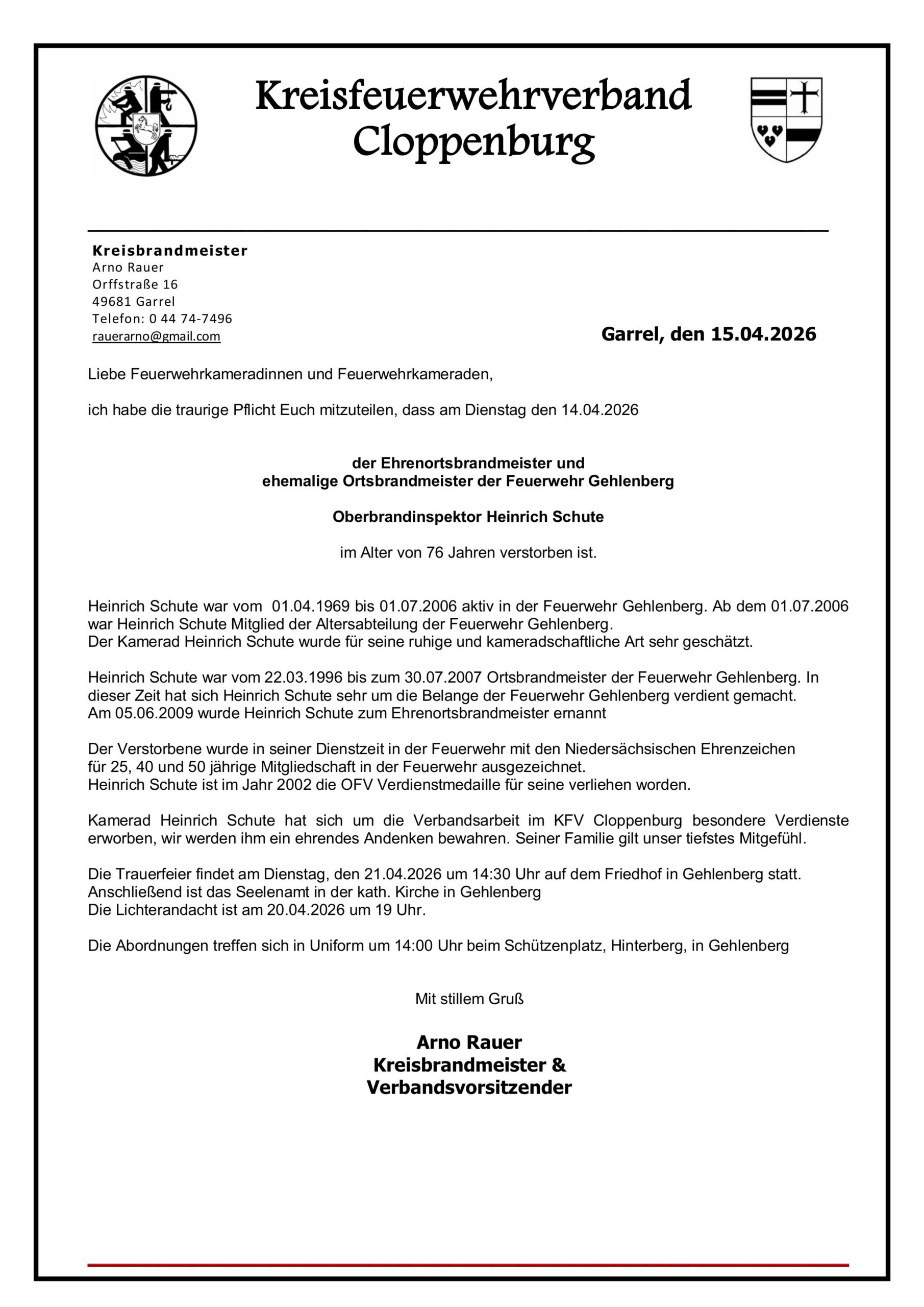 Der Kreisfeuerwehrverband Cloppenburg trauert um seinen Kameraden Heinrich Schute
